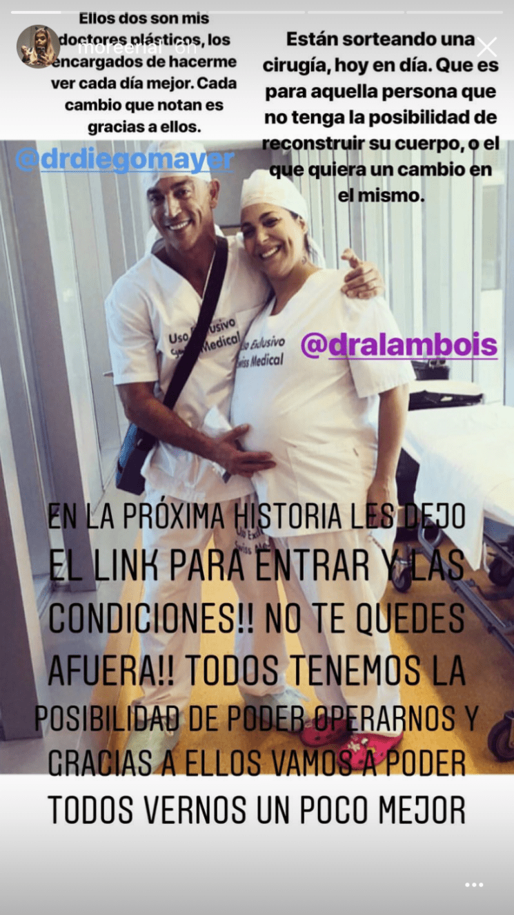 " Ellos dos son mis doctores plásticos, los encargados de hacerme ver cada día mejor. Cada cambio que notan es gracias a ellos. Están sorteando una cirugía, hoy en día, que es para aquella persona que no tenga la posibilidad de reconstruir su cuerpo o el que quiera un cambio en el mismo", escribió.