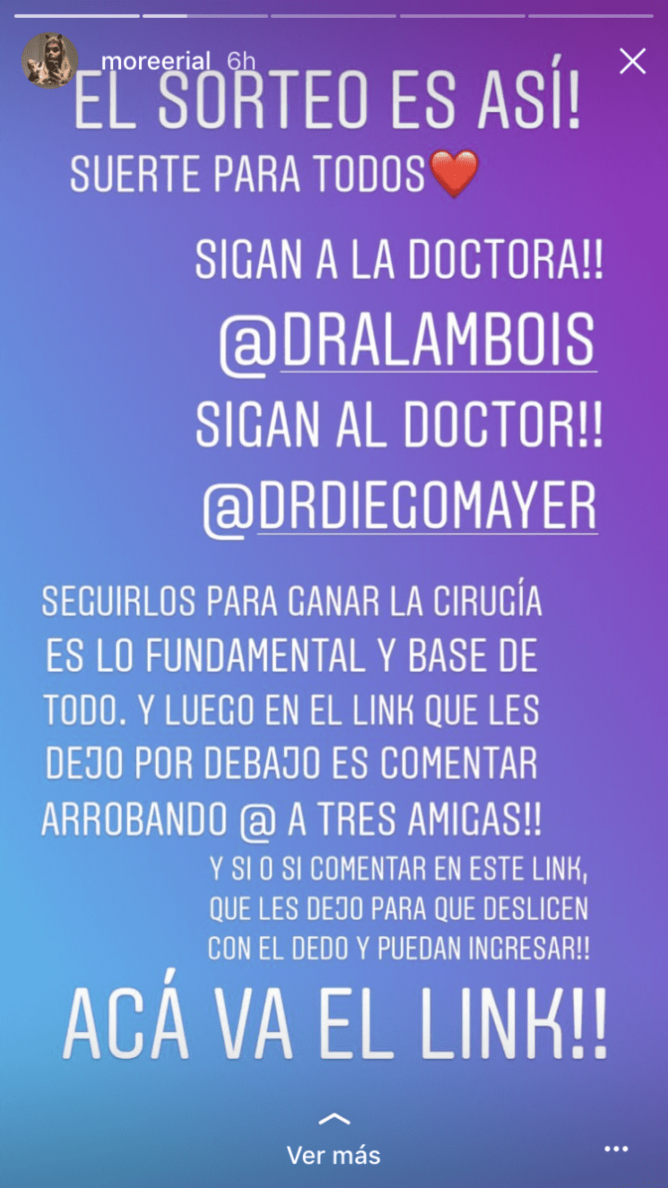 More Rial promociona en su perfil un polémico sorteo: una cirugía plástica. Mediante las "historias" la hija de Jorge Rial publicó el concurso y las condiciones para participar de este.