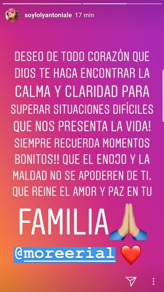 Y siguió: "¡Siempre recuerda momentos bonitos! Que el enojo y la maldad no se apoderen de ti. Que reine el AMOR y PAZ en tu familia @moorerial", concluyó la modelo, una ex del periodista con la que Morena mantiene buen diálogo.