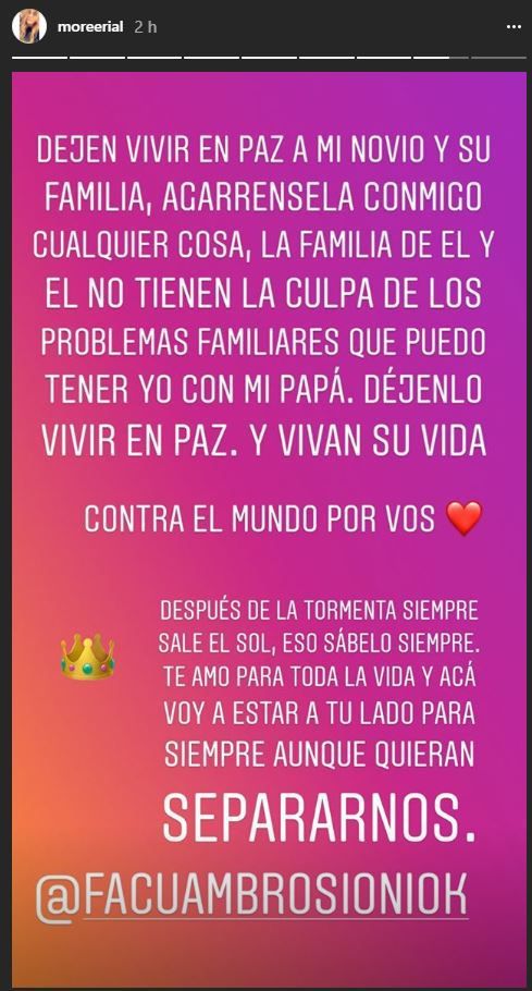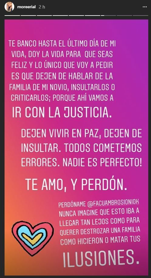 La joven de 19 años arrancó algo bélica en su nuevo descargo. Defendió a ultranza a su novio, pidió que no lo molestaran ni a él ni a su familia, le pidió disculpas por haberlo "expuesto" y le recordó lo importante que es para ella. " Perdóname, nunca imaginé que esto iba a llegar tan lejos como para querer destrozar una familia como hicieron o matar tus ilusiones", dijo.