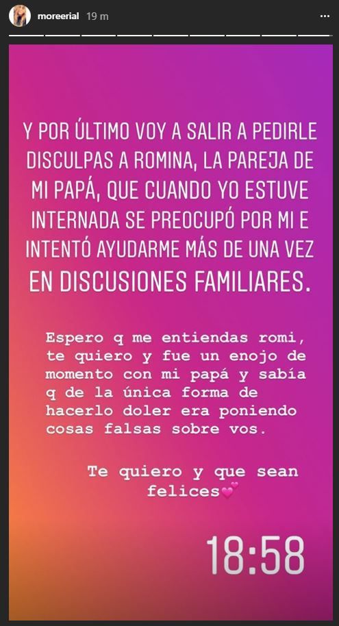 "Y por último voy a salir a pedirle disculpas a Romina, la pareja de mi papá, que cuando yo estuve internada se preocupó por mi e intentó ayudarme más de una vez en discusiones familiares", escribió.