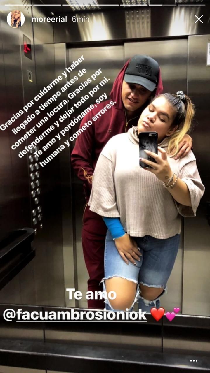 En la imagen, Morena está en un ascensor junto a su pareja, Facundo Ambrosioni. Pero hay un detalle que llama mucho la atención: una venda azul en su muñeca derecha.