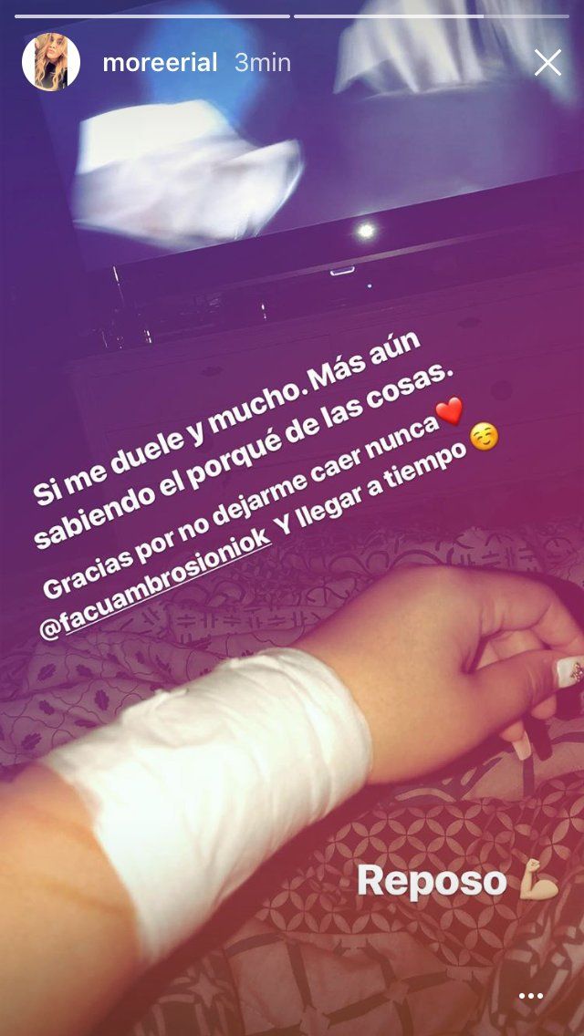 " Sí me duele, y mucho. Más aún sabiendo el por qué de las cosas. Gracias por no dejarme caer nunca Facundo Ambrosioni, y llegar a tiempo", escribió Morena junto a la imagen en primer plano de su muñeca vendada.