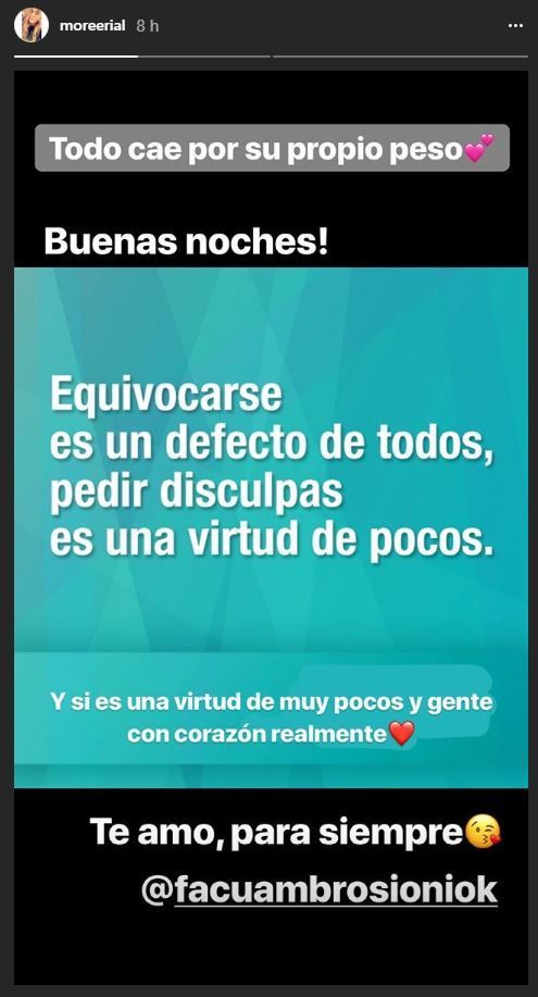Horas más tarde, publicó: " Todo cae por su propio peso" junto a la frase " equivocarse es un defecto de todos, pedir disculpas es una virtud de pocos". "Y si es una virtud de muy pocos y gente con corazón realmente", añadió la joven de 19 años.