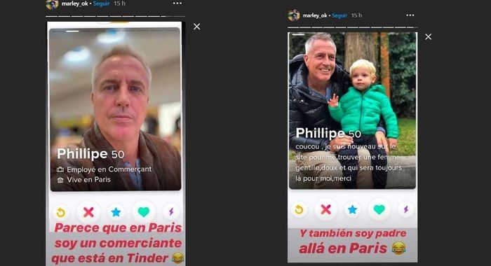 Marley mostró en sus redes un perfil falso de Tinder de origen frances en el que aparecen sus fotos, incluso con su hijo Mirko. Con humor, el conductor mostró que alguien utiliza la app de citas bajo el nombre de Phillipe y además afirma que tiene 50 años. Esto lo hizo enojar, ya que recién cumplirá esa edad el 1 de junio del próximo año.