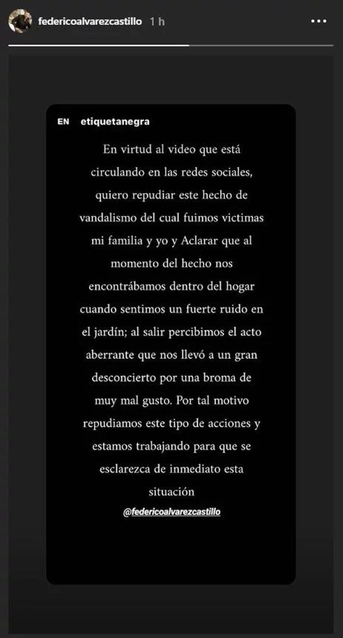 "Quiero aclarar que al momento del hecho nos encontrábamos dentro del hogar cuando sentimos un fuerte ruido en el jardín; al salir percibimos el acto aberrante que nos llevó a un gran desconcierto por una broma de muy mal gusto", indicó el empresario.
