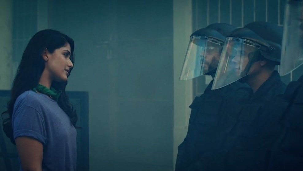 Fue la misma actriz quien le sugirió usar un pañuelo verde. Allí, se ve a la joven frente a un grupo de policías antidisturbios que trata de convencerlos con un mensaje de respeto y comprensión al otro, según canta Ricky.
