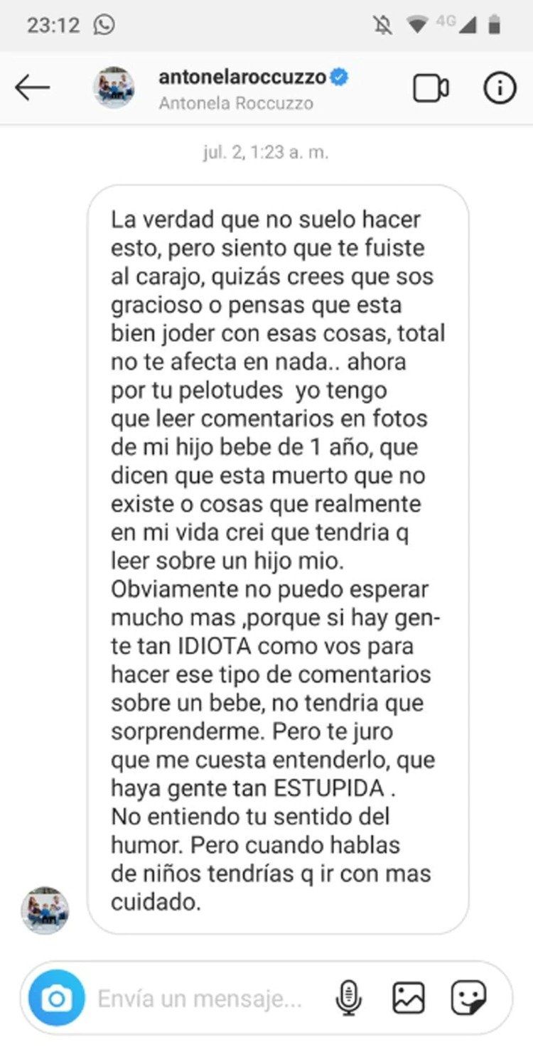 "La verdad que no suelo hacer esto, pero siento que te fuiste al carajo, quizás creés que sos gracioso o pensás que está bien joder con esas cosas, total no te afecta en nada -comienza el mensaje de Roccuzzo, que rápidamente se viralizó en las redes-. Ahora por tu pelotudez yo tengo que leer comentarios en fotos de mi hijo bebé de un año, que dicen que está muerto o que no existe o cosas que realmente en mi vida creí que tendría que leer sobre un hijo mío", agrega Antonela.