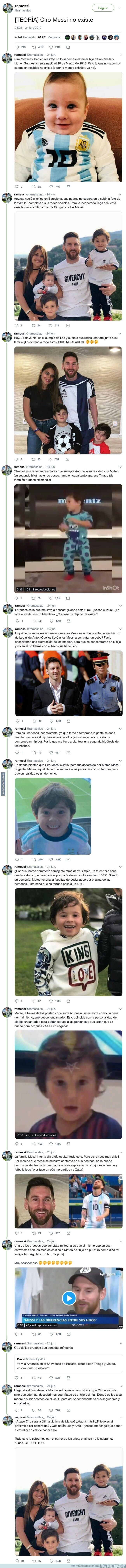 Todo comenzó en julio, cuando en la red social se especuló sobre la existencia de Ciro, el hijo menor de la pareja. Esta disparatada teoría, que se basa en la ausencia del niño en las presentaciones públicas del futbolista del Barcelona y su esposa (como en la entrega del último Balón de Oro, a principios de diciembre), habría enojado mucho a Antonela. Un hombre publicó en su cuenta de Twitter (con el usuario @ramasalas_) una captura de un supuesto mensaje suyo, que recibió hace algunos meses atrás.