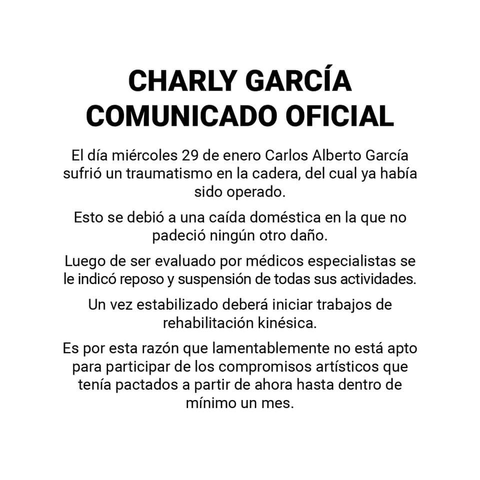Por su parte, desde la organización de Cosquín Rock ratificaron la información y a través de un comunicado en su cuenta de Twitter. En la notificación, lamentan el hecho de que Charly no pueda estar presente en los festejos de los 20 años del festival. A su vez, informan que la grilla de ambos días continuará tal cual lo anunciado.
