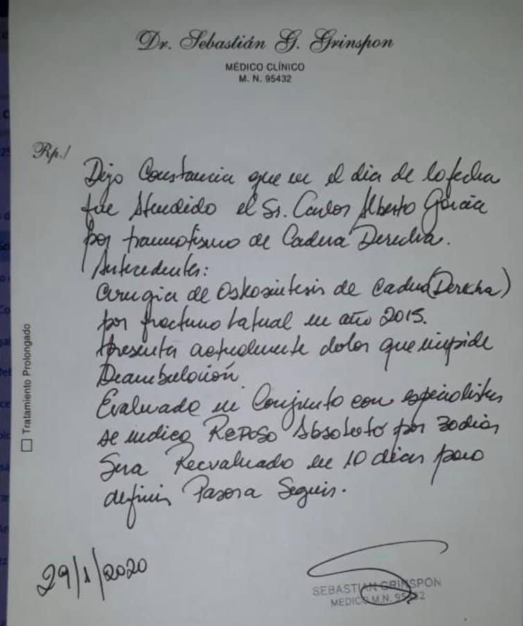 El artista ya había sido operado previamente de la cadera derecha en el año 2015. En la órden del médico que lo atendió, da cuenta de la intervención quirúrgica previa y deja constancia de que el paciente tiene un dolor que impide su deambulación. Además, indica que al haberlo evaluado con un grupo de especialistas, prescribe que deberá hacer reposo absoluto por 30 días. Luego destaca que será evaluado nuevamente en un período de 10 días para decidir los pasos a seguir.