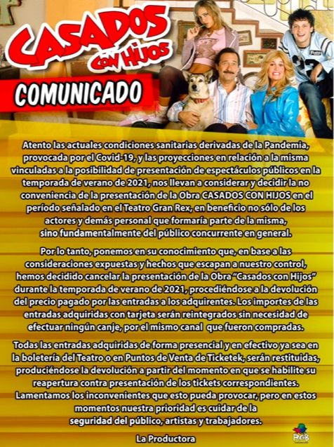 Asimismo, la productora señala que las entradas adquiridas en forma presencial y en efectivo será restituidas cuando se rehabilite la apertura de los puntos de venta de Ticketek y la boletería del teatro. "Lamentamos los inconvenientes que esto pueda provocar, pero en estos momentos nuestra prioridad es cuidar de la seguridad del público, artistas y trabajadores", concluye el escrito.