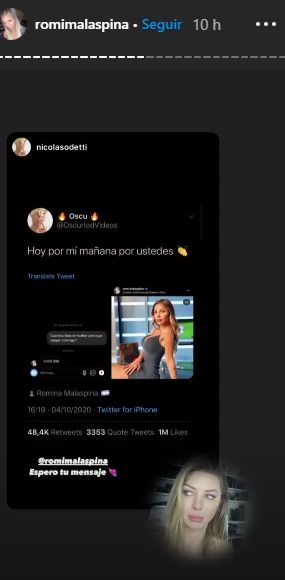 Fue a través de un mensaje privado donde Oscu le preguntó Malaspina: "¿Cuántos likes en Twitter para que salgas conmigo?", a lo que ella respondió: ·1.000.000. A continuación, el cantante publicó una captura de la conversación junto con la foto de la modelo.