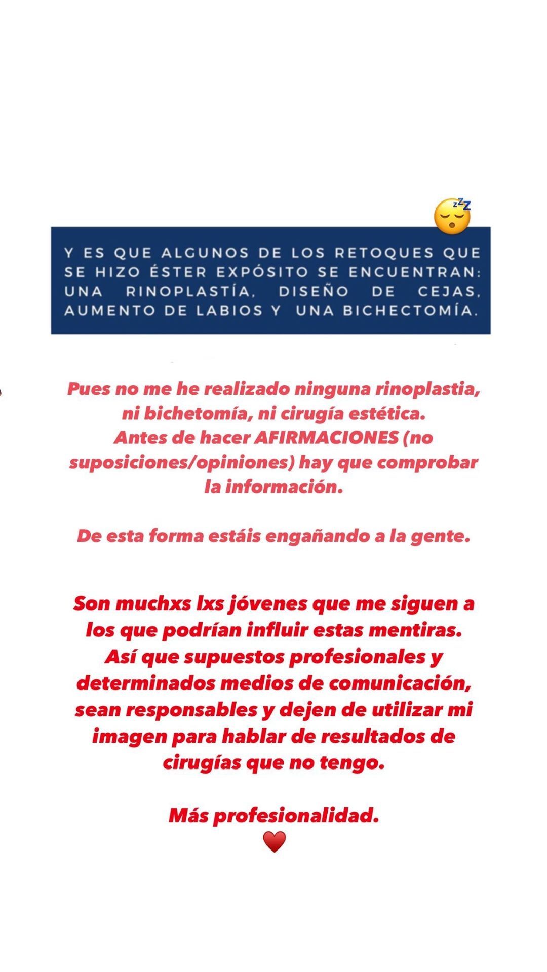La joven de Madrid escribió: “Pues no me he realizado ninguna rinoplastia, ni bichetomía, ni ninguna cirugía estética”, desmintiendo aquellas intervenciones que se le adjudicaron. Además, llamó la atención de los periodistas diciendo: “Antes de hacer AFIRMACIONES (no suposiciones/ opiniones) hay que comprobar la información”, Expósito es muy filosa y demostró que sabe cuándo responder.