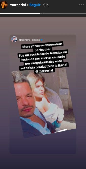 El pavimento mojado por la lluvia y una imprudencia de la mediática habrían generado un trompo y el coche terminó impactando contra el guardarraíl. Tanto Morena como su hijo, Francesco Ambrosioni, y la mujer que los acompañaba, resultaron ilesos.