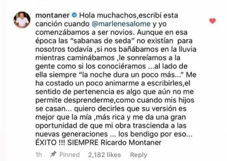 Rápidamente Ricardo Montaner se manifestó y expresó, hay momentos de la vida que suelen recordarse con melancolía, ya que en aquella época cuando comenzó su carrera no dormía en sábanas de seda como dice la canción, una melodía que le dedicó a su actual esposa, cuándo comenzaron a ser novios.