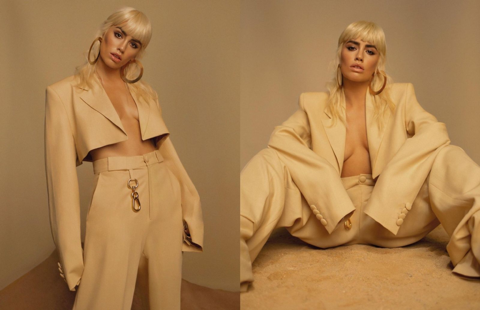 Con un formal conjunto dorado haciendo juego con su actual color de pelo, y acompañando sus piezas de ropa con algunos accesorios; la artista desplegó gran sensualidad al mostrarse con el saco desabrochado.