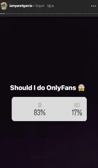 Yanet les preguntó a sus casi 14 millones de followers si “Debería hacerse una cuenta de OnlyFans?” a lo que la gran mayoría le respondió que sí. El mencionado servicio de suscripción londinense le pagaría 30 dólares por cada suscriptor.