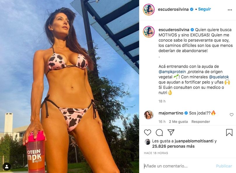 "Quien quiere busca MOTIVOS y sino EXCUSAS! Quien me conoce sabe lo perseverante que soy, los caminos difíciles son los que menos deberían de abandonarse!", escribió junto a la foto que ya superó los 25 mil "likes" y obtuvo centenares de comentarios referidos al escultural cuerpo de la morocha.