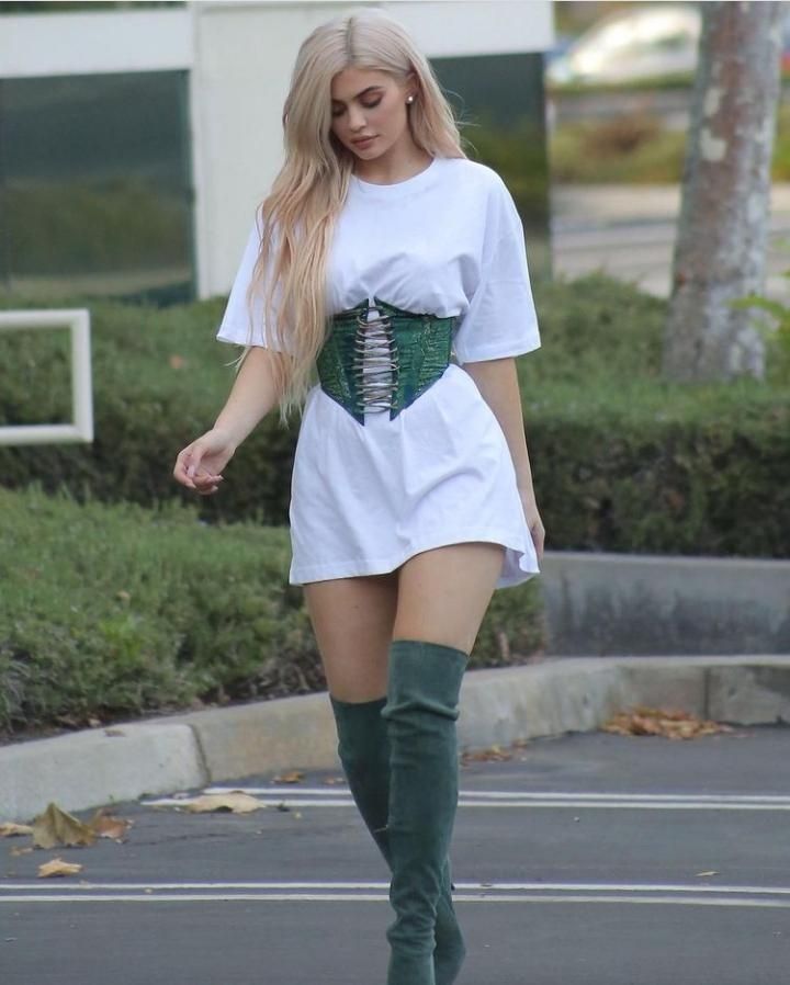 Kylie Jenner posó sin pantalones y utilizó unas maxi botas en color verde, las cuales combinó con un camisón en color blanco y definió su cintura con un cinturón en la misma tonalidad que sus botas.