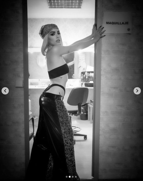 En una serie de fotos en blanco y negro que la cantante publicó en su cuenta de Instagram, Espósito mostró su ropa interior de tiro alto, acompañada de pantalones tiro bajo y un top del mismo color.