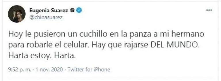 La Modelo furiosa estalló en las redes e hizo un fuerte descargo. "Hoy le pusieron un cuchillo en la panza a mi hermano para robarle el celular. Hay que rajarse del mundo. Hasta estoy. Harta", escribió en su cuenta de Twitter.