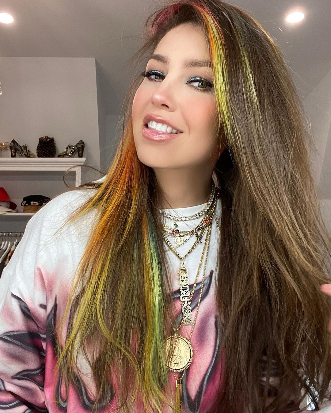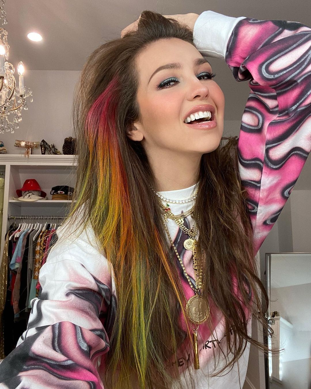 En su última publicación mostró su nuevo look. Thalía tiene el pelo con mechas de colores como un arcoíris, una tendencia de este 2020. Para el pie de foto el mensaje fue muy positivo: “La vida es un cúmulo de momentos, encuentra la felicidad siendo tú”.