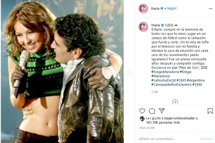 “Estarás siempre en la memoria de todos los que te vimos jugar en un campo de fútbol como el campeón que fuiste y serás. ¡Yo te veía de niña por el televisor con mi familia y vibraba la casa de emoción con cada uno de tus movimientos jamás igualados! Fue un placer conocerte años después y compartir contigo. Descansa en paz Pibe de Oro”, este fue el mensaje emotivo con el que Thalía le dio el último adiós a Diego Maradona.