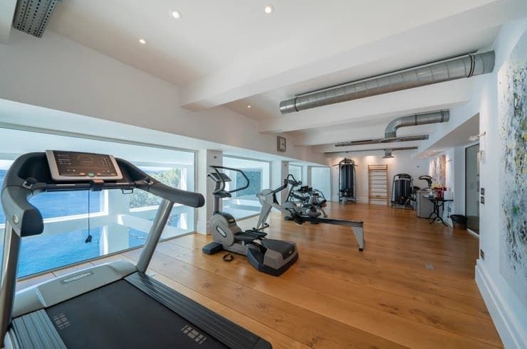 La mansión francesa cuenta con cinco habitaciones, cinco baños, tres salones para recibir invitados, un gimnasio y múltiples terrazas, además de dos piscinas internas y externas, una de ellas con agua salada. También tiene una bodega, un lavadero y un piso para el personal sobre el garaje, con una combinación de detalles de época que incluye pisos de madera de tablones anchos y toques modernos, como ventanas de vidrio de piso a techo y un ascensor.