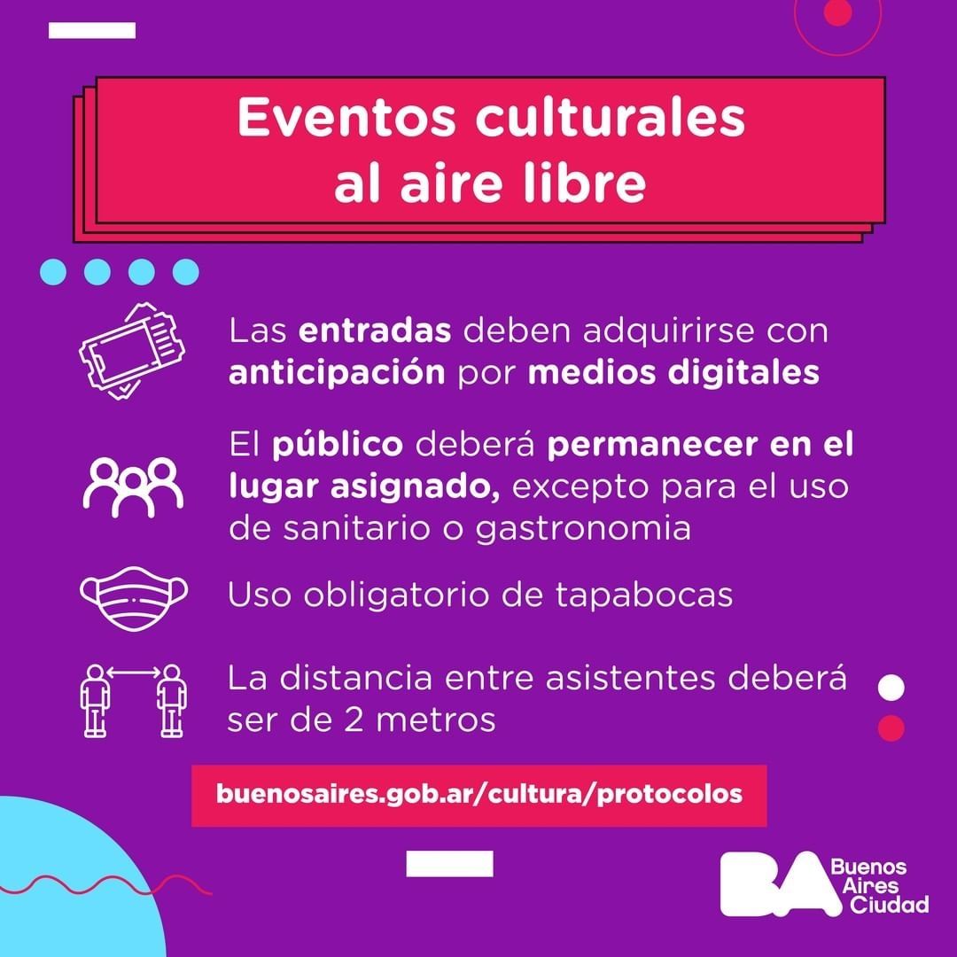 "Se aplica para todos los eventos culturales, en la medida que puedan garantizar una superficie de ocupación de 4m2 por persona, es decir: 1 persona cada cuatro metros cuadrados y la distancia entre asistentes deberá ser de 2 metros", continúa el protocolo sanitario .