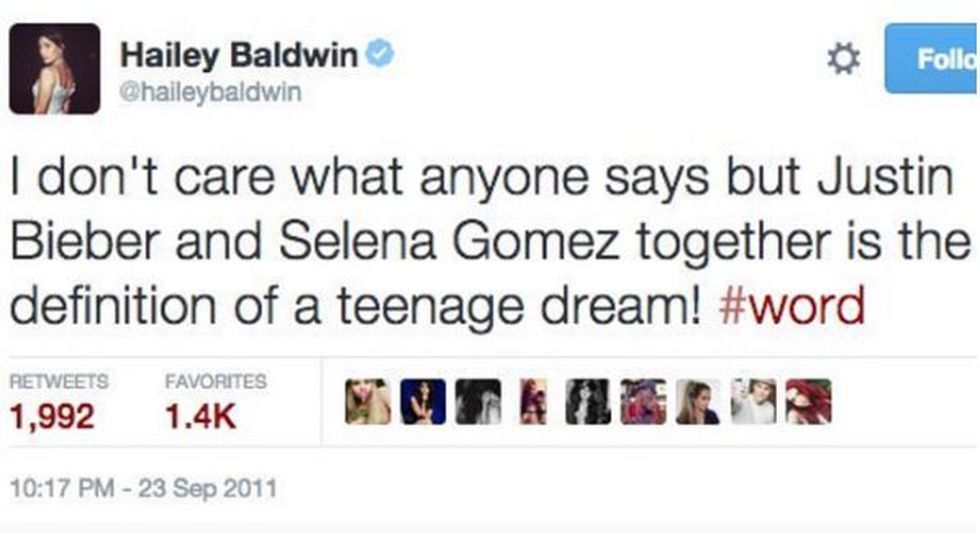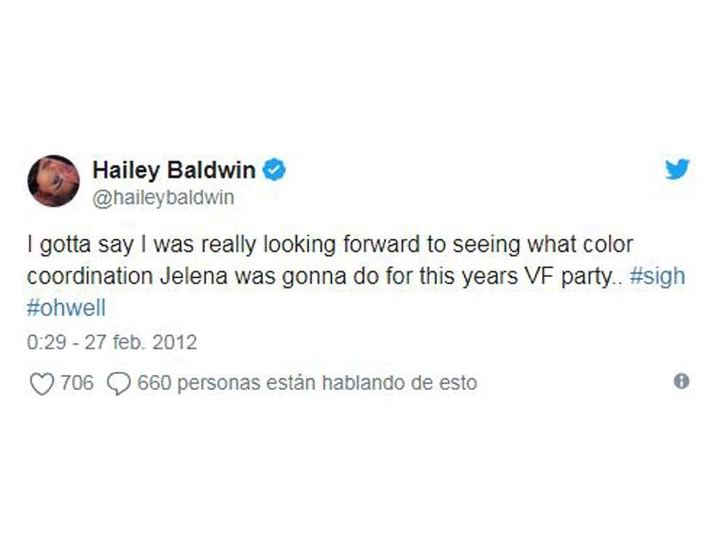 Hailey reveló en unos comentarios que hizo en su Twitter que era fanática de la “couple goal” entre Selena y Justin: “Debo decir que realmente estaba deseando ver qué coordinación de colores iba a hacer Jelena para la fiesta de VF de este año… #sigh #ohwell”, escribió allá por el 2011 la modelo.