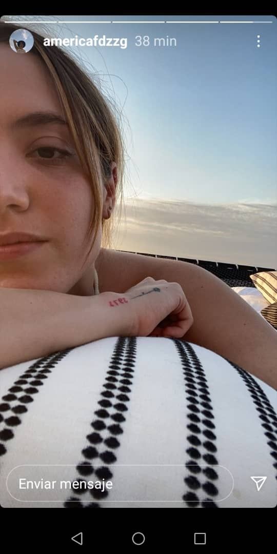 En otra imagen América presume frente a las cámaras un tatuaje que tiene en la mano, mientras se encuentra acostada boca abajo disfrutando de una excelente bronceado.
