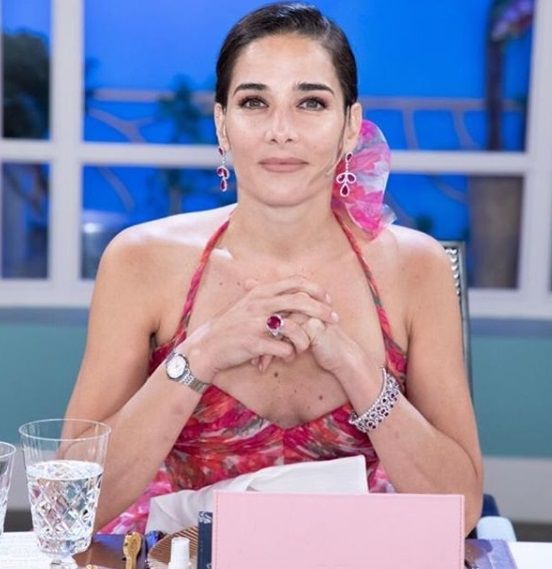 El outfit lo acompañó con unos hermosos aros, un anillo de rubíes y pulseras de rubíes y brillantes. El pelo lo llevó recogido y el toque final lo dio el maquillaje de sus ojos con mezcla de sombras color rojo y marrón.