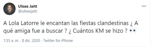Minutos más tarde la esposa de Diego Latorre hizo un sorpresivo anuncio respecto a su hija: "Acabo de decidir que mi hija no vuelve al Cantando. A ella, ni Nacha ni nadie le dicen caso perdido. Qué mina de mierda. 80 años al pedo". Y reveló los pormenores de su determinación: "Lola me llamó llorando, desesperada. ¿Alguien hace todo tan perfecto como para ajusticiar así a una chica de 19?".
