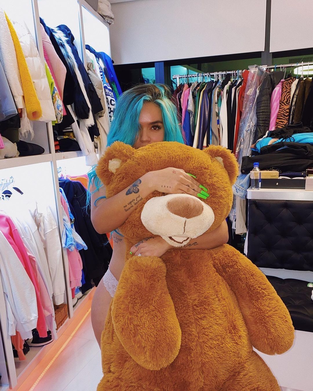 Esta vez no fue la excepción ya que recientemente la intérprete de "Ay Dios mío" compartió en su perfil de Instagram una foto de ella donde se la tapándose solo con un oso. Por lo que claramente dejó a sus fanáticos sumamente enamorados.