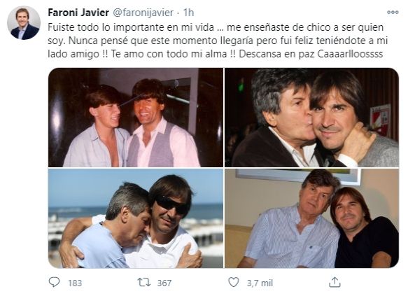 Así lo comunicó esta mañana su amigo Javier Faroni a través de las redes sociales. "Fuiste todo lo importante en mi vida... me enseñaste de chico a ser quien soy", escribió el productor teatral. "Nunca pensé que este momento llegaría pero fui feliz teniéndote a mi lado amigo !! Te amo con todo mi alma !! Descansa en paz".