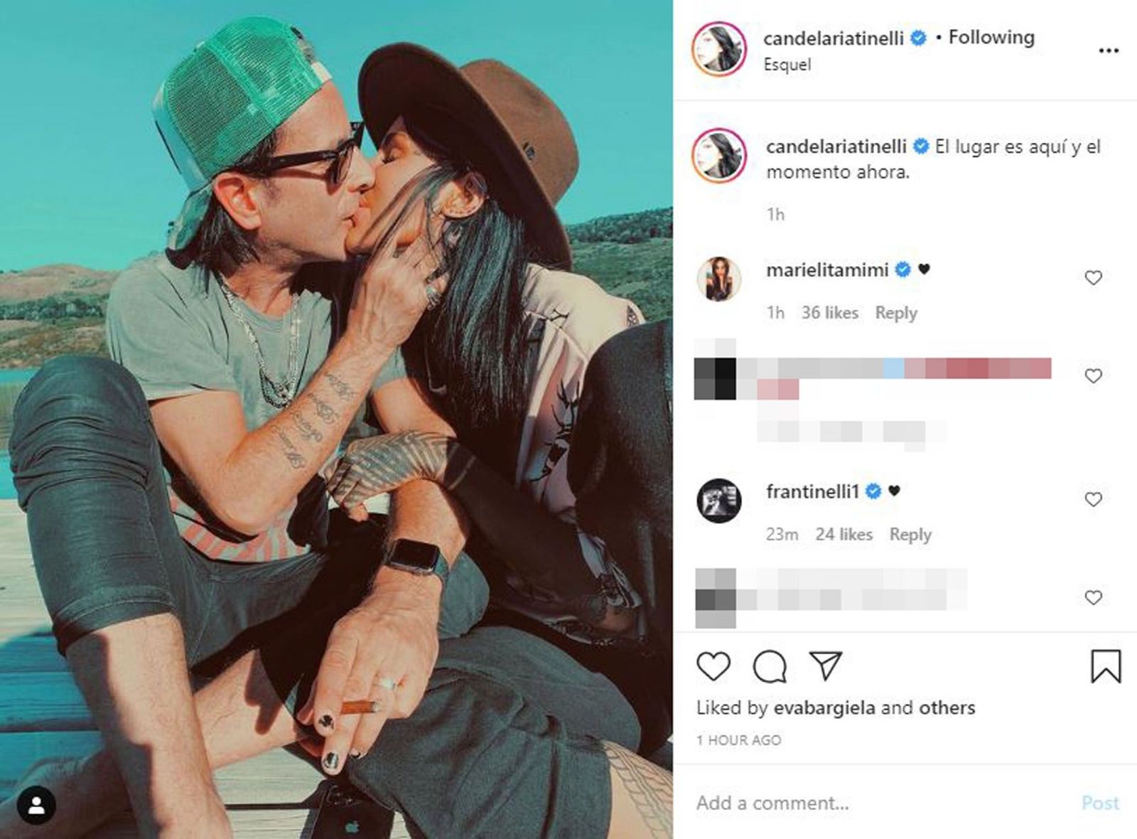 La pareja ha decidido transitar libremente su romance, y la forma que encontraron para despejar la polémica es la de mostrarse en la red sin darle crédito a comentarios maliciosos. En estos días, la influencer compartió una postal junto al músico en la que disfrutan su amor a puro beso apasionado en Esquel. "El lugar es aquí y el momento ahora", escribió en el epígrafe.
