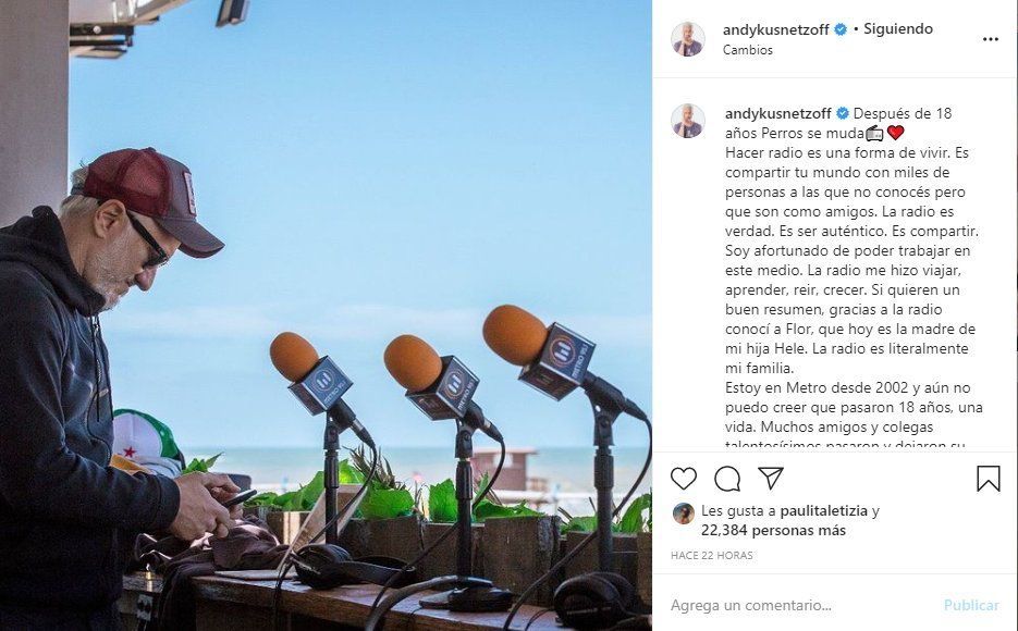 "Después de 18 años, Perros se muda. Hacer radio es una forma de vivir. Es compartir tu mundo con miles de personas a las que no conocés, pero que son como amigos. La radio es verdad. Es ser auténtico. Es compartir. Soy afortunado de poder trabajar en este medio. La radio me hizo viajar, aprender, reír, crecer. Si quieren un buen resumen, gracias a la radio conocí a Flor, que hoy es la madre de mi hija Hele. La radio es literalmente mi familia", expresó el presentador.
