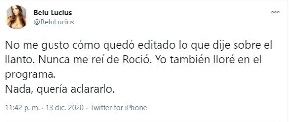 "No me gustó cómo quedó editado lo que dije sobre el llanto. Nunca me reí de Rocío. Yo también lloré en el programa. Nada, quería aclararlo", escribió Lucius en su cuenta de Twitter.