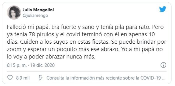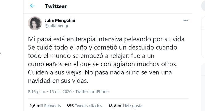 "Mi papá está en terapia intensiva peleando por su vida. Se cuidó todo el año y cometió un descuido cuando todo el mundo se empezó a relajar: fue a un cumpleaños en el que se contagiaron muchos otros. Cuiden a sus viejxs. No pasa nada si no se ven una navidad en sus vidas", publicó Mengolini el pasado 15 de diciembre en su cuenta de Twitter.