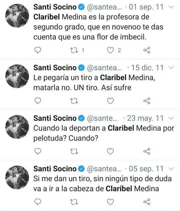 "Claribel Medina es la profesora de segundo grado que en noveno te das cuenta de que es una flor de imbécil", "Le pegaría un tiro. Matarla no. Un tiro así sufre", "¿Cuándo la deportan por pelotu...? ¿Cuándo?", "Si me dan un tiro, sin ningún tipo de duda, va a ir a la cabeza de Claribel Medina", fueron algunos de los gravísimos, xenófobos, repudiables y violentos tweet del rugbier.