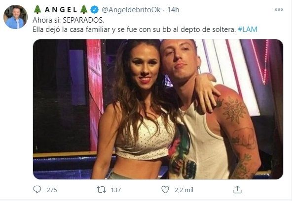"Ahora si: SEPARADOS. Ella dejó la casa familiar y se fue con su bebé al departamento de soltera", escribió junto a una fotografía donde se los ve a ambos abrazados posando para la cámara.