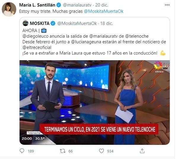 Días atrás, la repentina salida del aire de María Laura Santillán sorprendió a todos. Con un breve pero conciso mensaje rompió el silencio y expresó lo que le generó abandonar el ciclo televisivo luego de 17 años. "Estoy muy triste", escribió en su cuenta de Twitter.