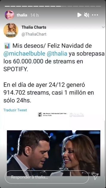 Ariadna Thalía Sodi Miranda disfruta del éxito de la canción realizada en conjunto con Michael Bublé “Mis Deseos/Feliz Navidad”, la cual generó casi 1 millón de streams en Spotify el día 24 de diciembre.