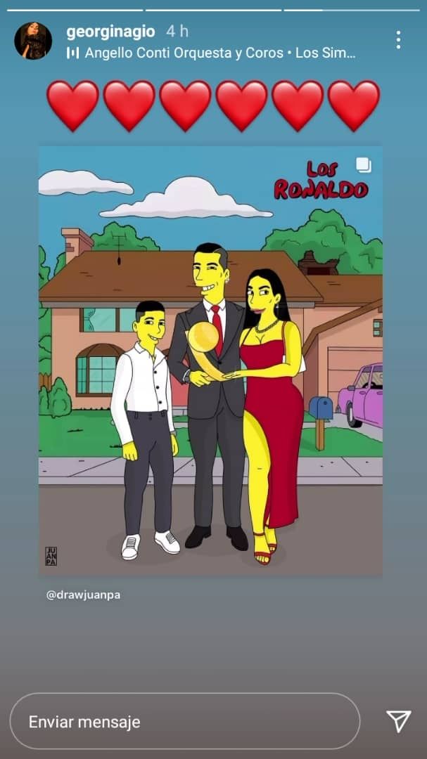 También, Georgina cautivó a todos sus fans con una publicación que realizó en las historias de su Instagram, se trata de una caricatura al estilo de Los Simpson, la cual es un reflejo de la instantánea que se tomaron días anteriores, para celebrar el premio de Cristiano Ronaldo en los Globe Soccer Awards.