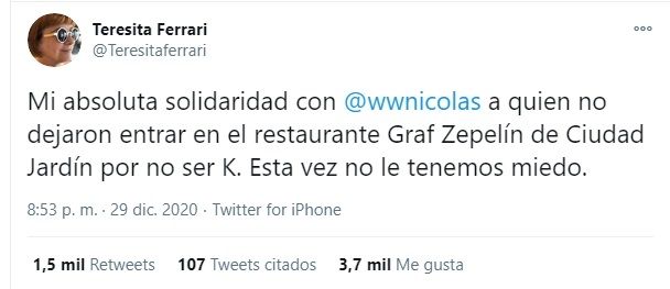 "Mi absoluta solidaridad con @wwnicolas a quien no dejaron entrar en el restaurante Graf Zepelín de Ciudad Jardín por no ser K. Esta vez no le tenemos miedo", redactó Teresita Ferrari, una periodista freelance en la red social del pajarito.