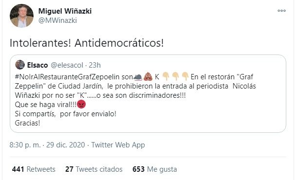 Por su parte, Miguel Wiñazki, su padre, citó un tuit y agregó: " Intolerantes! Antidemocráticos!". "#NoIrAlRestauranteGrafZepoelin son K En el restorán 'Graf Zeppelin' de Ciudad Jardín, le prohibieron la entrada al periodista Nicolás Wiñazki por no ser 'K'... o sea son discriminadores. Que se haga vira. Si compartís, por favor envialo. ¡Gracias!", versa el mensaje que compartió el hombre.