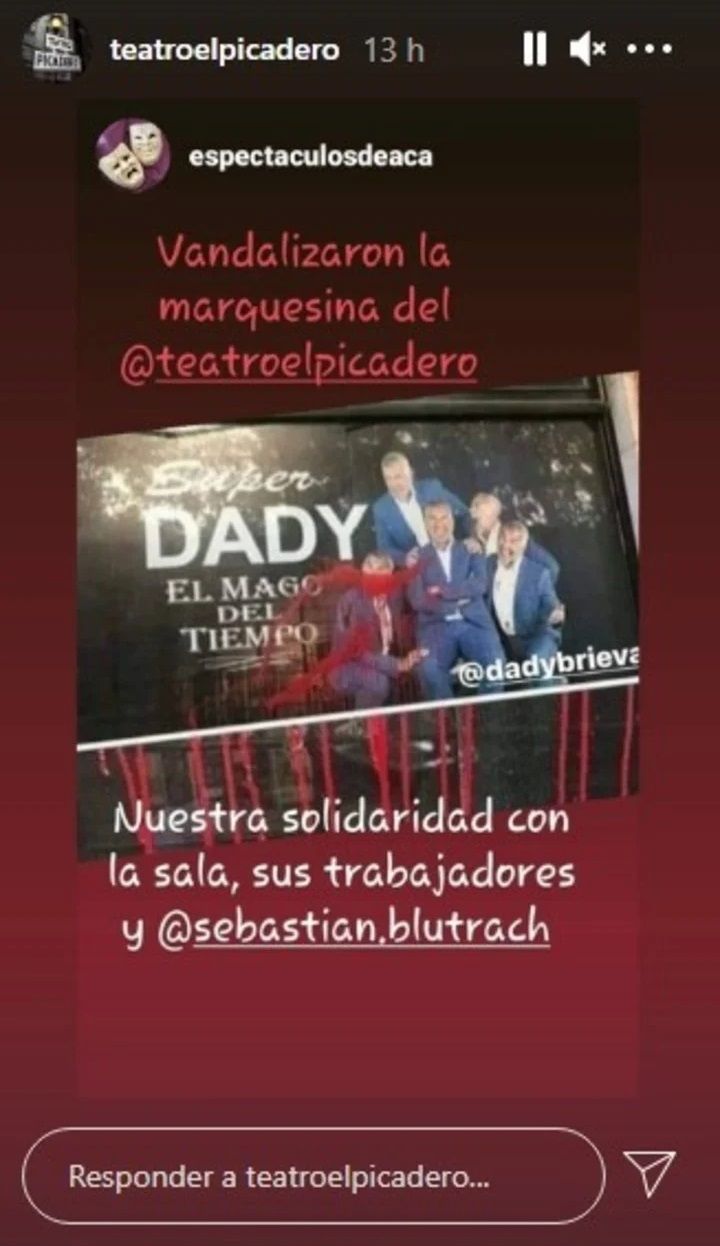 A menos de un mes del gran debut de Dady Brieva en el Teatro Picadero con 'Súper Dady, El mago del tiempo', su nuevo espectáculo, el actor vivió un tristísimo episodio. Un grupo de vándalos intervino la entrada del espacio cultural y la marquesina de la obra con pinturas y excremento.