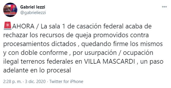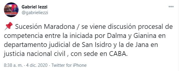 La noticia fue confirmada por Gabriel Iezzi, periodista de A24, en un tuit: "Hoy se sorteó en Cámara Nacional Civil el inicio de la sucesión de Diego Maradona, resultó asignado el Juzgado Civil Nº 44".