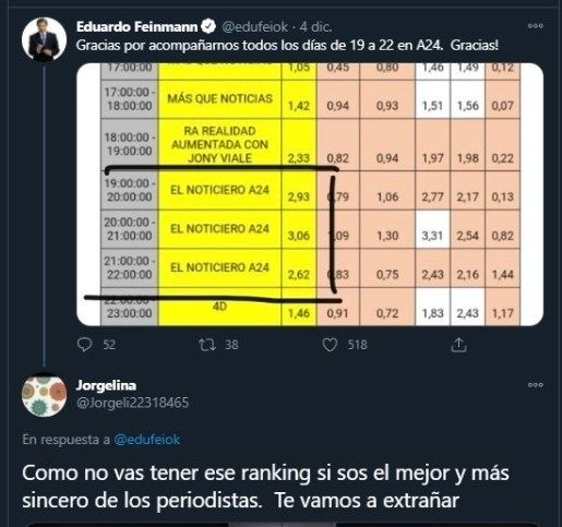 "Gracias por acompañarnos todos los días de 19 a 22 en A24. ¡Gracias!", compartió Feinmann en su cuenta de Twitter hace unos días junto a las notables mediciones de rating de su programa. A partir de las versiones de su salida del canal, sus fans se volcaron a las redes mostrando su conmoción.